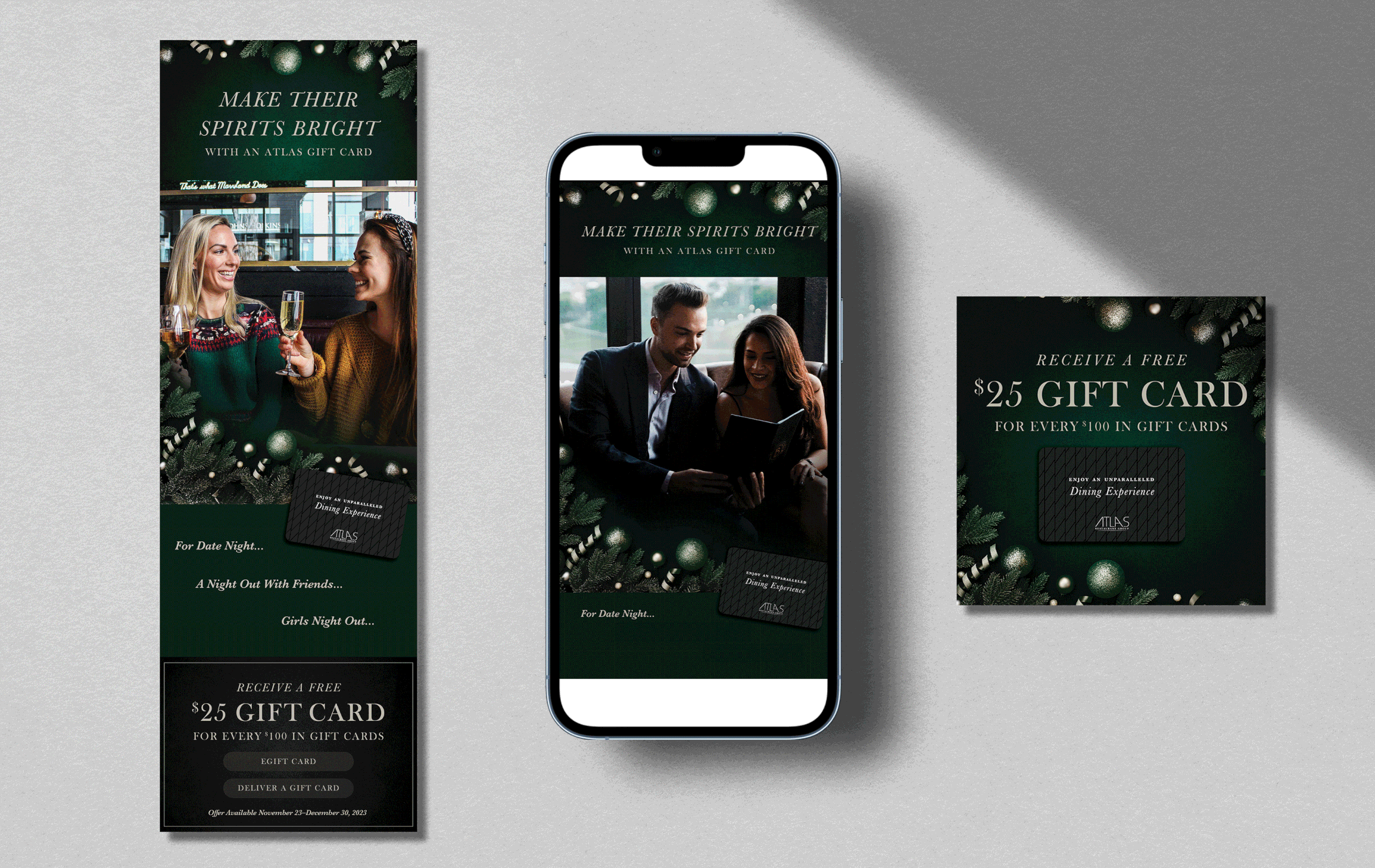Drawing upon the unique typography featured in the logo, we focused on developing the distinct angles of the iconic "Atlas A." Embracing the striking contrast of black and white, we created a narrative of bold elegance that's both visually compelling, modern, and edgy which also communicates our commitment to change and enhance the dining scene in Baltimore and beyond.