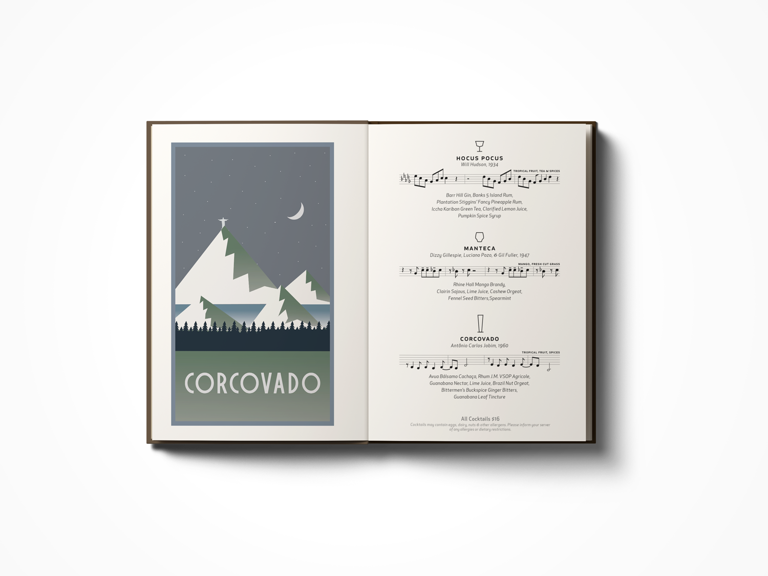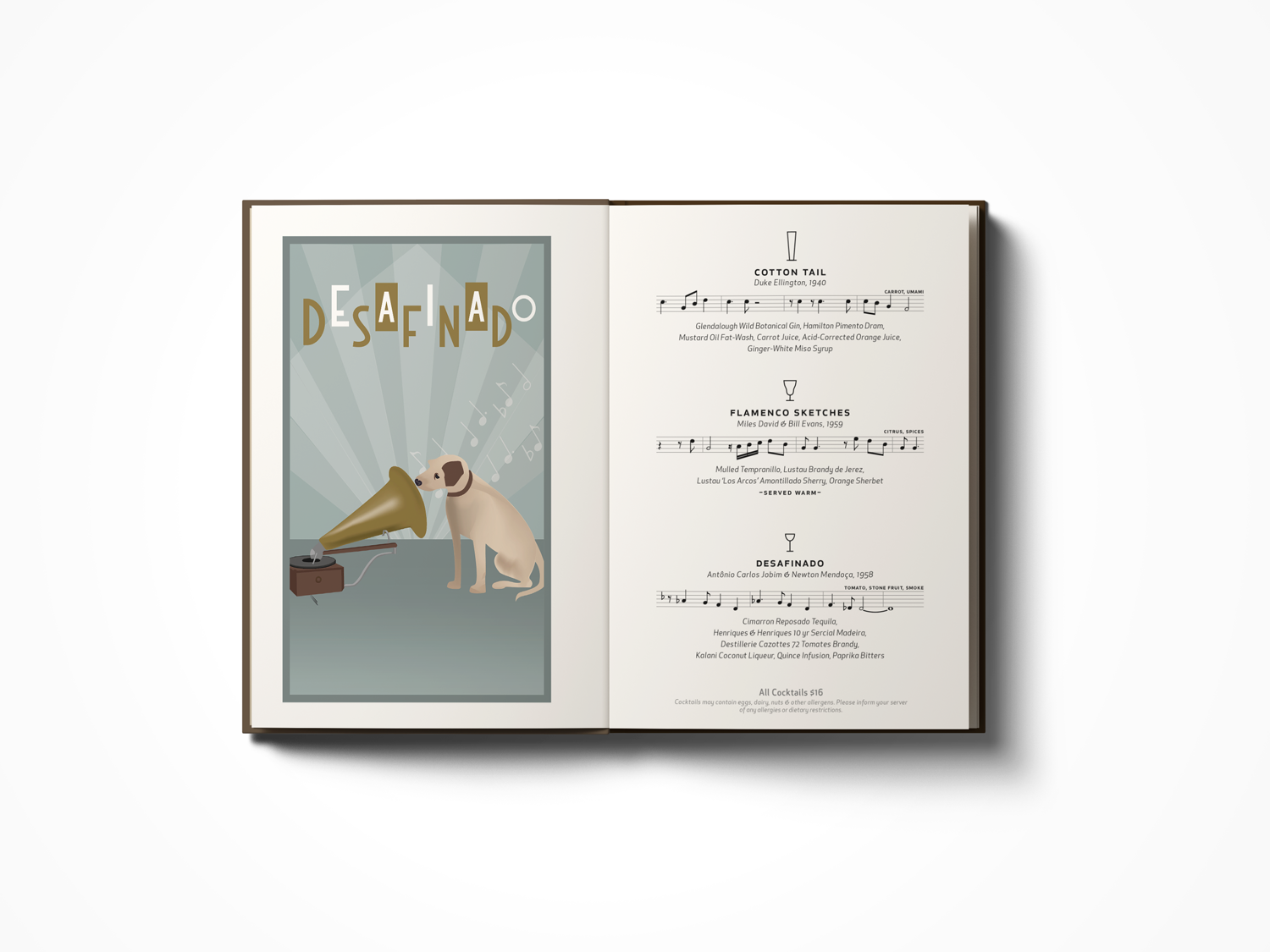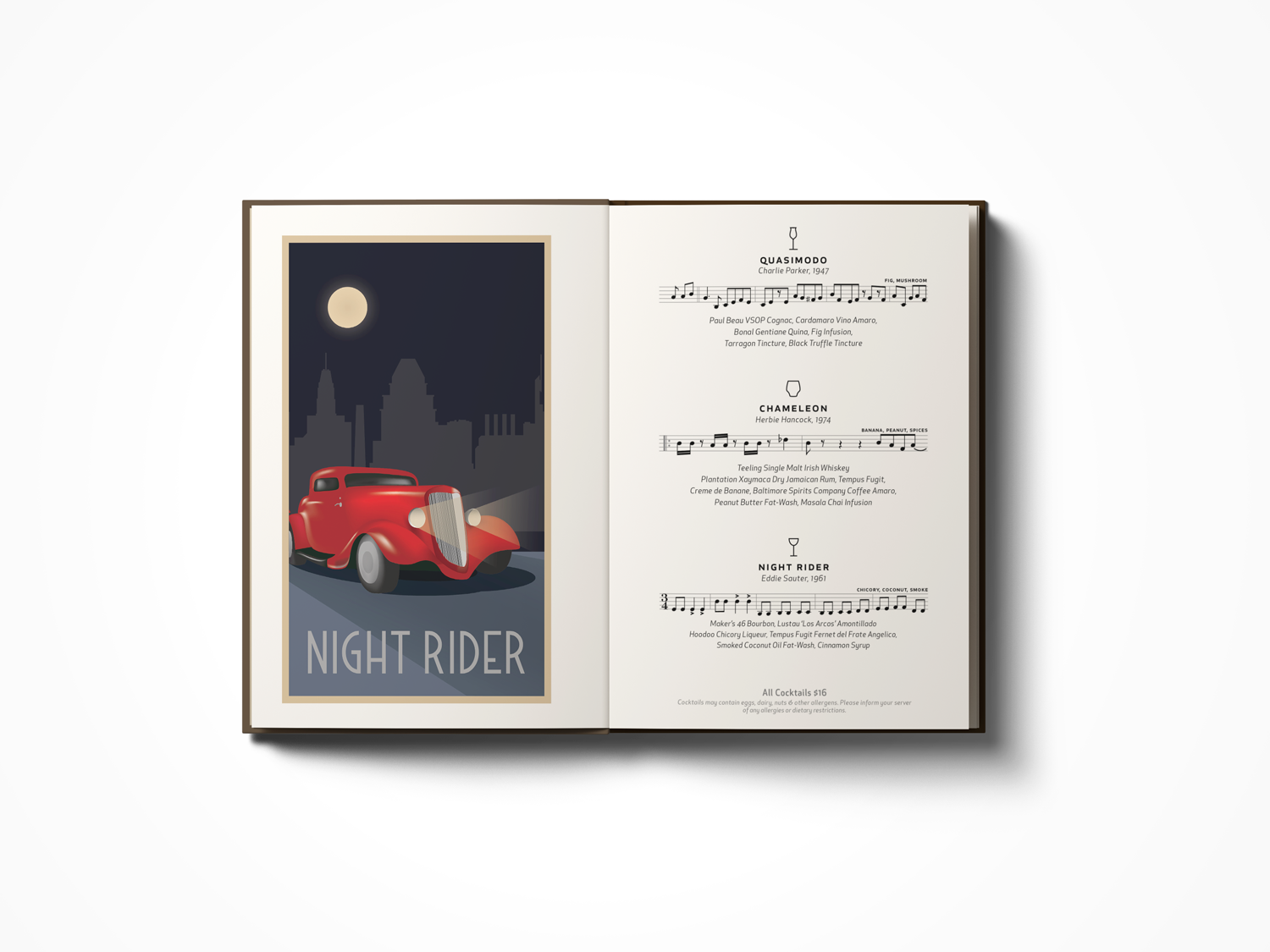 A seasonal menu was inspired by Jazz classics like Miles Davis and Duke Ellington with each cocktail being named after notable songs from that era. Six original illustrations inspired by Cassandre were created to push the 1920’s menu concept. Menu descriptions and flavor profiles were incorporated to look like sheet music. A QR code was included on the opening page linking to a Spotify playlist all of the songs/ cocktails in the menu for a more interactive experience.